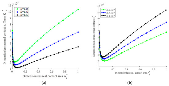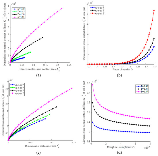 The effect of fractal dimension on the contact characteristics of helical gear is shown in Figure 9, in which changed with the real contact area under the influence of D and G. It can be observed from Figure 9a,b that increased with the increase in the real contact area, the larger D is, the greater is. This is because when G is constant, the greater the D, the smoother and more complex the contact surface is with the increase in D, and the same contact range has more scale and smaller asperities, which makes the real contact area of the contact surface larger under the same load, thereby increasing of the gear surface. Similarly, Figure 9c,d shows that the relationship between and is negatively correlated with G. When the real contact area is constant, decreases with the increase in G. This is because G is used as a parameter to characterize the roughness, which reflects the smoothness of the vertical direction of the contact surface. The greater the G is, the greater the amplitude of asperity is, leading to a corresponding reduction in the real contact area under the same load. It can be concluded that is affected by D and G. D and G are used as parameters to characterize the rough surface to describe the surface topography. The larger D and the smaller G show that the contact surface is smoother. To summarize, reducing the roughness of the contact surface can improve the stiffness characteristics of the gear.