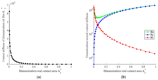 The effect of oil film on fractal contact characteristics of helical gear is shown in Figure 10a. When and , of the oil film changed with . When approached 0, was the greatest. With the increase in , decreased rapidly and tended to be gentle after was greater than 0.3, and the change was the most dramatic before was less than 0.1. Additionally, the variation of equivalent comprehensive NCS (), solid part NCS (), and the oil film part NCS () with dimensionless real contact area are shown in Figure 10b. When was small, was far lower than , and the equivalent comprehensive NCS was almost completely determined by . Additionally, with the increase in the real contact area, the rate of gradually increased, and its share in the equivalent comprehensive NCS gradually increased. The ratio of to the equivalent comprehensive NCS gradually decreased, and finally it changed such that dominated the equivalent comprehensive NCS. This is because when the load was small, the contact between gear surfaces was the squeeze between oil films, which is consistent with the existing research conclusions [27]. With the increase in load, the oil film was squeezed out, increased sharply and decreased.