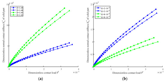 The effect of asperity lateral contact and interaction on Ks is shown in Figure 12. In Figure 12a, G is , and D is 1.40 and 1.48, respectively. In Figure 12b, D is 1.40, and G is and , respectively. The curve with the circle represents the model without considering asperity lateral contact and interaction. The curve with the triangle represents the model with consideration of asperity lateral contact and interaction. When the load was constant, the NCS calculated by the model considering asperity lateral contact and interaction was significantly lower than that of the model without considering asperity lateral contact and interaction. This is because, when considering the lateral contact and interaction of asperity, the contact force required for the same contact deformation was greater. Therefore, when the load was constant, the contact deformation of asperity considering lateral contact and interaction was relatively small, and its corresponding real contact area was also small, resulting in a decrease in the calculated normal contact stiffness of the tooth surface. Moreover, the larger D is, the greater the number of the asperities per unit area is. The increase in G will cause a greater the amplitude of the asperity, a greater the load borne by a single asperity, and a greater influence of the lateral contact and interaction of asperity. Overall, the greater the load, the greater the lateral contact and interaction of asperity. The above studies show that the influence of the lateral contact and interaction of the asperities cannot be ignored in the investigation of the contact between tooth surfaces. The research results offer the theoretical basis for further accurate study of gear contact.