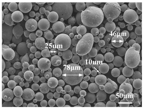 The selected cladding material was a Ni-based alloy powder, with a size of 10–78 μm. The morphology is shown in Figure 1. The chemical composition of the Ni-based alloy powder is included in Table 2.