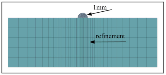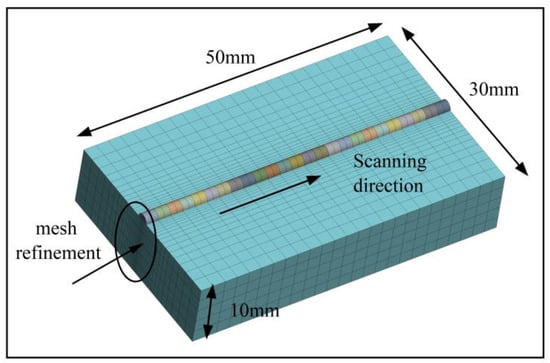 The TC4 alloy was used as the substrate. The coating thickness was set to 1 mm. Figure 2 shows the finite element model on the TC4 substrate. The grid is refined near the cladding layer. The transition grid technology was used to coarsen the regional grid away from the cladding layer to reduce the calculation cost and time. The 3D mesh refinement is shown in Figure 3.