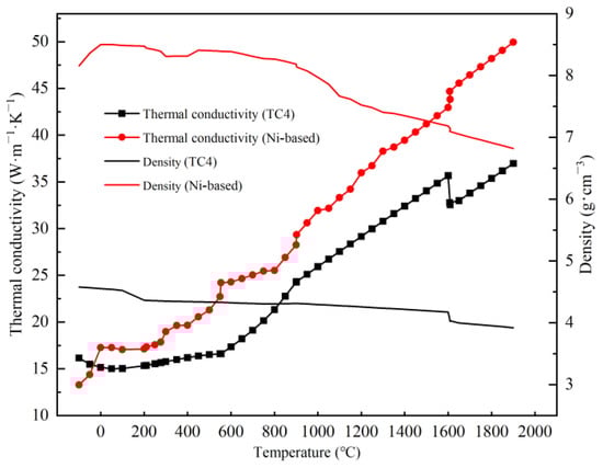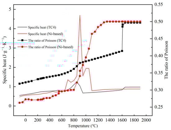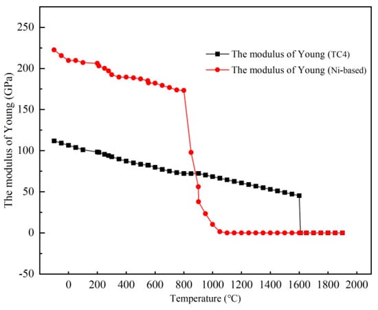 The JMatPro10.0 software was used to obtain the thermal physical and mechanical properties of cladding material and TC4, because the performance parameters of the material would change with the temperature during the laser cladding process. The thermal physical and mechanical properties are shown in Figure 4, Figure 5 and Figure 6.