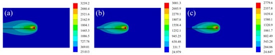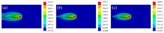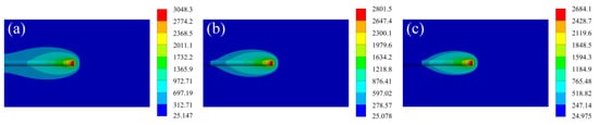 The temperature field distribution of the laser cladding process at laser power 1500 W with different scanning speeds. (a) 2 mm/s; (b) 3 mm/s; (c) 4 mm/s.