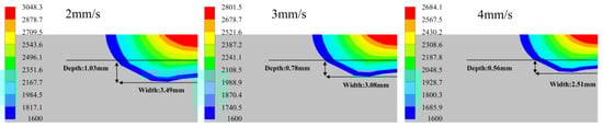 The temperature field distribution of the laser cladding process at laser power 1700 W with different scanning speeds. (a) 2 mm/s; (b) 3 mm/s; (c) 4 mm/s.
