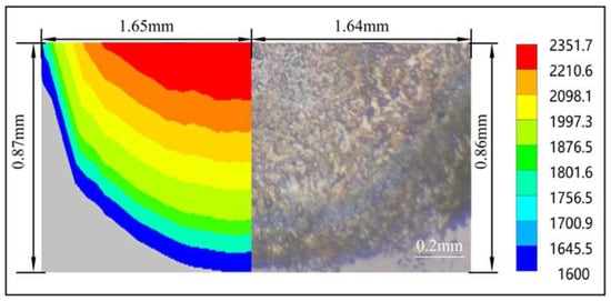 Figure 13 shows the comparison between the simulated molten pool and the fabricated coating at laser power of 1600 W and laser scanning speed of 3 mm/s. Since the solidus temperature of TC4 alloy is 1600 °C, the simulated pool size can be obtained. The simulated pool depth is 0.87 mm and the width is 1.65 mm. The depth of the coating’s molten pool calculated by experiment is 0.86 mm and the width is 1.64 mm. From the comparison of depth and width, the size of Ni-based coating is consistent with the simulated result.