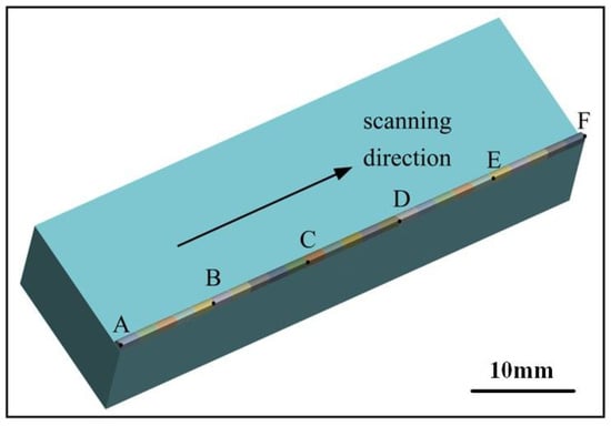 Some points A, B, C, D, E and F were selected to investigate the temperature field distribution at the same distances in the scanning direction, as shown in Figure 14.