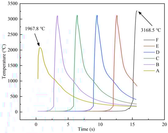 Figure 15 shows the temperature change at different times in the horizontal direction. It can be seen that the temperature rises and falls of B~E points have similar trends. The maximum temperature of point A is 1967.8 °C. The maximum temperature of F point is 3168.5 °C. The reason is that the laser irradiation time is short at the beginning of laser cladding. With the accumulation of laser heat, the maximum temperature of the selected points increases. So, point F has a large amount of heat accumulation and the highest temperature.