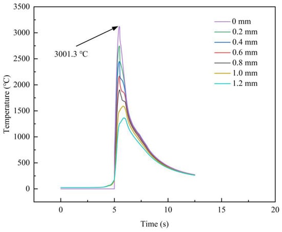 Figure 16 shows the longitudinal temperature when the laser cladding is carried out for 7 s. It can be seen that the temperature has a similar trend at different distances. The top position has the maximum temperature. The highest temperature in the laser molten pool can reach 3001.3 °C.