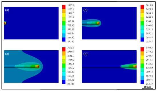 Figure 17a–d show the temperature field clouds of points A, B, D and F in Figure 14. Some nodes near different positions are either heated or cooled during the laser cladding process. It leads to a large temperature gradient in the scanning direction. The molten material absorbs heat in a very short time, which makes the internal temperature increase drastically, while the molten layer can only dissipate heat through heat conduction and air convection.