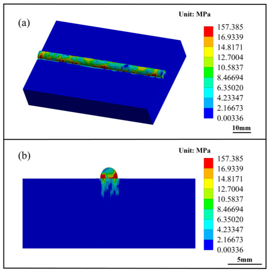 Figure 18 shows the residual stress field in the horizontal and vertical directions of the cladding layer. Figure 18a shows the residual stress field in the horizontal direction; it can be seen that the maximum residual stress appears near the surface of the Ni-based cladding layer and the edge area on both sides. The stress concentration phenomenon is due to the high energy at the heat source’s center and the low energy at the periphery. Figure 18b shows the residual stress field in the vertical direction; the stress is larger around the bonding zone between the Ni-based cladding layer and the TC4 substrate. This is caused by the different properties of the Ni-based cladding material and TC4 substrate, which cause stress concentration. Therefore, there is a maximum residual stress around the bonding zone between the Ni-based coating and the TC4 substrate.