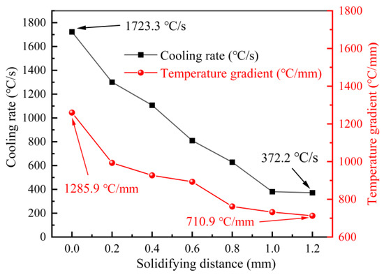 From the previous study, cooling rate and temperature gradient were the key parameters to the coating’s quality. As can be seen in Figure 19, it shows the variation of temperature gradient and cooling rate at different positions from the Ni-based cladding layer to the bottom in the molten pool. The maximum temperature gradient is 1285.9 °C/mm near the top of the Ni-based cladding layer. The minimum temperature gradient is 710.9 °C/mm. The temperature gradient shows a fast-slow-fast-slow trend from the top of the Ni-based cladding layer to the bottom of the molten pool. The reason is that the difference of temperature is too large between the unheated area and the surface of the Ni-based cladding layer. There is a large cooling rate near the top of the cladding layer. The values of maximum and minimum cooling rates are 1723.3 and 372.2 °C/s. The cooling rate decreases with the increase of distance from the top of the Ni-based cladding layer.