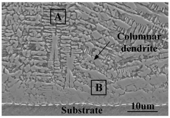 Figure 20 shows the microstructures in regions A and B at the bottom of the Ni-based coating. As can be seen in Figure 20, some columnar dendrites appear at the bottom of the coating’s molten pool. Due to the negative correlation between the growth of crystals’ grain size and the cooling rate of the molten pool, the grain size decreases when the cooling rate becomes large. While the cooling rate is relatively small, the grains have enough time to grow. So, the size in region B is relatively large. In front of region B, the grain size becomes smaller at region A.