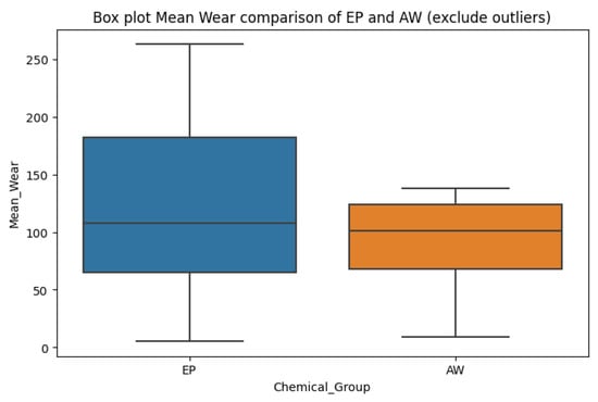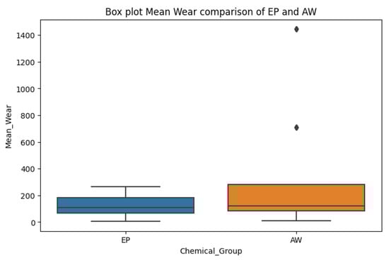 Figure 5 illustrates that the average wear of AW has outliers (2 dots in red rectangle shape). After removing these outliers, a clearer representation of the distribution of the average wear for both EP and AW is shown in