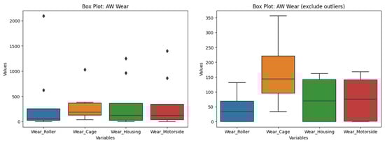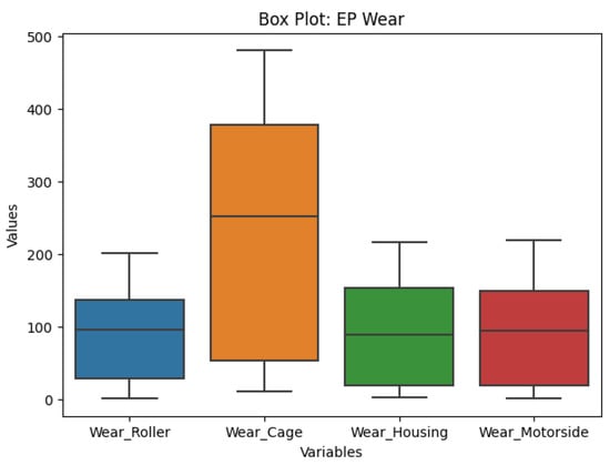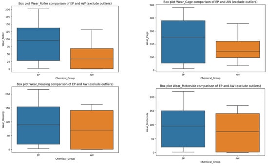 Figure 7, overall, the median lines on the box plots suggest that EP lubricants tend to have higher wear attributes than AW across all four wear types. For the roller and cage types, AW data cluster tightly around the median and show much lower wear compared to EP. By contrast, for the housing and motorside types, the wear data for AW are more spread out, with the medians slightly different from EP.