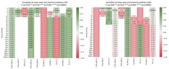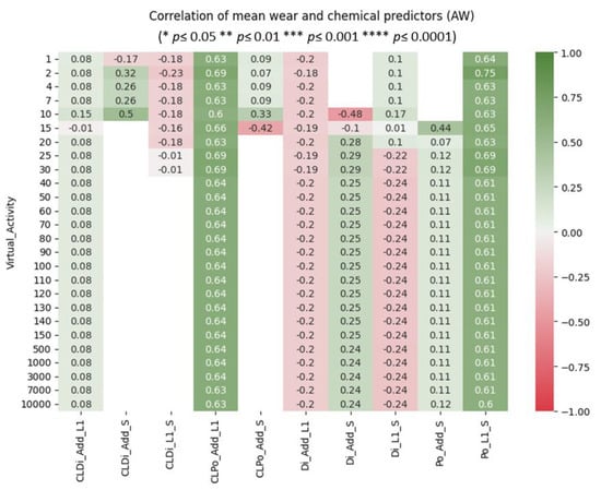 For activities ranging from 1 to 10, both CLPo_Add_L1 and Po_L1_S in AW indicate a positive and moderately strong correlation with average wear. Meanwhile, other chemical predictors display only weak correlations. However, they are not statistically significant (