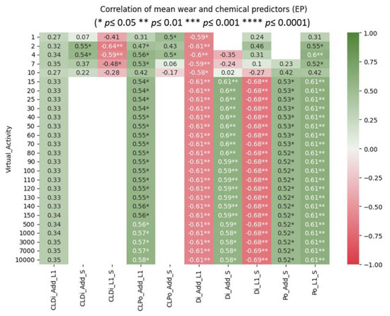 In the EP group, activity 4 is the only activity where Po_L1_S exhibits a positive and moderately strong relationship. Activity 2 shows that CLDi_L1_S and Di_Add_L1 have a negative, moderately strong correlation with average wear. A positive, moderately strong correlation is evident between average wear and both Di_Add_S (for activities 15–80) and Po_L1_S1 (for activities 4 and 15–10,000). Conversely, both Di_Add_L1 and Di_L1_S show a negative, moderately strong correlation between the average wear in activities 2, 4, and 15–10,000 and 15–10,000, respectively. Importantly, all these observed correlations are statistically significant (
