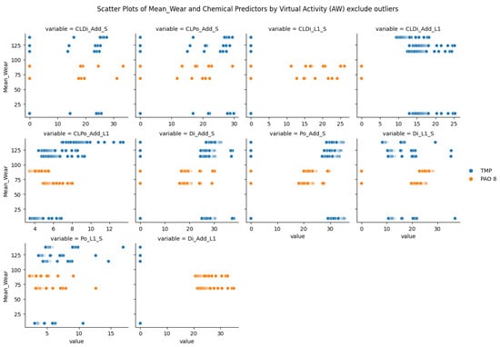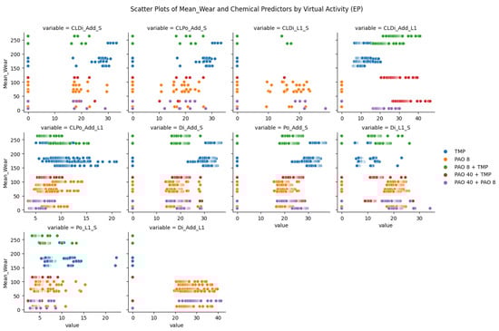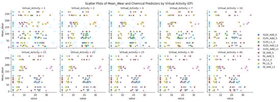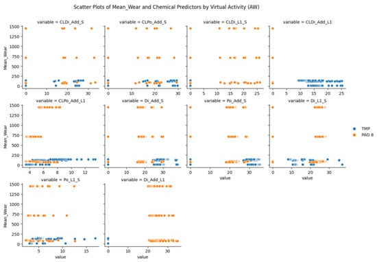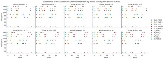 Figure 14, Di_Add_L1 exclusively resides in the low-wear zone and exhibits a negative correlation with average wear. By contrast, other chemical predictors are present in both the high- and low-wear zones. Notably, ‘CLDi_Add_S’ is observed in activities 1, 2, 4, and 7, while both ‘CLPo_Add_S’ and ‘CLDi_L1_S’ appear in activities 1, 2, 4, 7, and 10.