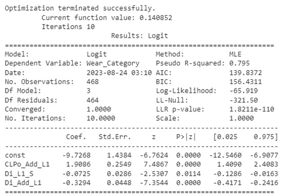 This logistic regression model shows that “CLPo_Add_L1” and “Di_Add_L1” have statistically significant positive and negative influences, respectively, on the probability of being in the high wear category, while “Di_L1_S” has a statistically significant negative influence (