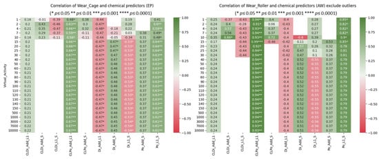 We used correlation analysis in our study to evaluate the linear relationships between chemical predictors and average wear. The correlation coefficients (r) were calculated to provide an indication of the strength and direction of these interactions. An r value near 1 or −1 indicates a strong positive or negative connection, respectively, whereas values closer to 0 imply a weaker link. Positive correlation indicates that one variable increases as the other increases, and negative correlation means that, as one variable increases, the other decreases.