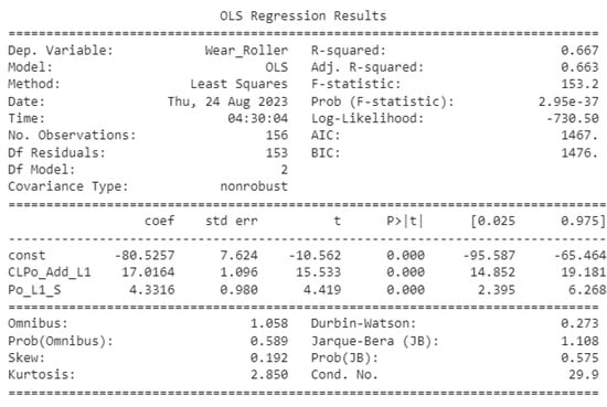 Figure 24). Additionally, we included Po_L1_S as it contributed to an improved R-squared value. The results of this regression analysis yielded an adjusted R-squared of 0.67. This figure indicates that the selected independent variables in the model, such as “CLPo_Add_L1” and “Po_L1_S,” explain approximately 66% of the variation in the dependent variable, “Wear_Roller.” Notably, some prospective predictors were excluded from the model on purpose. Their lack of statistically significant relationships with the dependent variable and their inability to enhance the adjusted R-squared value led to this conclusion.