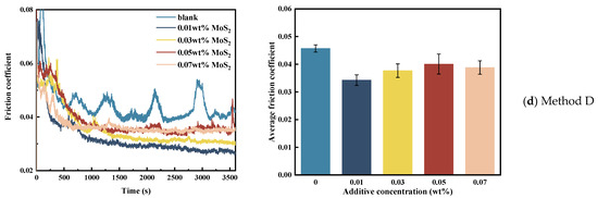 “Method C” and “Method D” are different in the addition time of additives. It can be seen in Figure 2d that when MoS2 was added via “Method D”, the friction coefficient curves of MoS2 grease with different mass fractions were stable, and the optimal content of MoS2 corresponding to this method was 0.01 wt%, and its average friction coefficient was 0.034. This was a 26.1% reduction compared to the blank group.