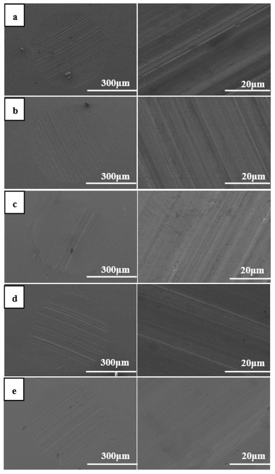 Figure 4 shows the SEM images of worn surfaces corresponding to blank lubricating grease and lubricating grease with the optimal mass fraction of MoS2 added in different ways. In Figure 4a, it can be seen that the worn surface corresponding to the blank grease exhibits obvious wear scar tracks, with wide and large furrows on the wear scar tracks. The wear scar tracks on the steel ball surface (Figure 4b–e) corresponding to the lubricating grease containing the MoS2 additive become relatively less obvious, and the surface becomes smoother. This may be because MoS2 has a layered structure that is easy to slide, so it can form a stable film on the friction surface under friction conditions, thereby achieving an anti-wear effect.