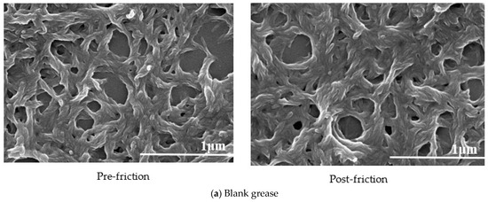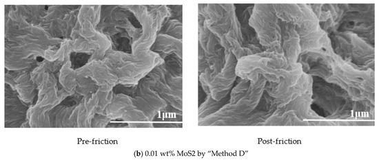 Figure 5 shows the SEM images of the soap fiber structure of blank grease and lithium-based lubricating grease prepared by adding MoS2 through “Method D” with the best tribological performance under the friction test conditions of 392 N, 1450 r/min, and 60 min before and after friction. By comparison, it can be found that the network structure of soap fiber of blank lithium-based grease was sparse before and after the friction. The more compact the soap fiber structure, the higher the drop point of the grease, the better the colloidal stability [26]. The soap base structure of “Method D” had small pores and strong oil absorption capacity, so it can act on the friction pair for a long time and play a role in reducing friction and anti-wear. The soap fiber structure of the blank grease and the grease of “Method D” did not change between pre-friction and post-friction, respectively. This shows that the performance of lithium-base grease is excellent, and the addition of MoS2 has no obvious effect on the structure of soap fiber.