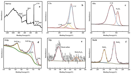 XPS spectra of the worn surface caused by 0.01 wt% MoS2 lithium grease prepared via “Method D”, (a) XPS survey spectrum, (b) C 1s, (c) O 1s, (d) Fe 2p, (e) S 2p, (f) Mo 3d.