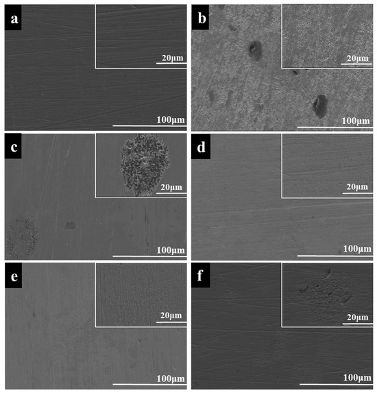 SEM image of GCr15 steel sheet embedded with 0.01 wt% MoS2 lubricating grease prepared via different addition methods after 15 days: (a) original steel surface, (b) blank grease, (c) Method A, (d) Method B, (e) Method C, (f) Method D.