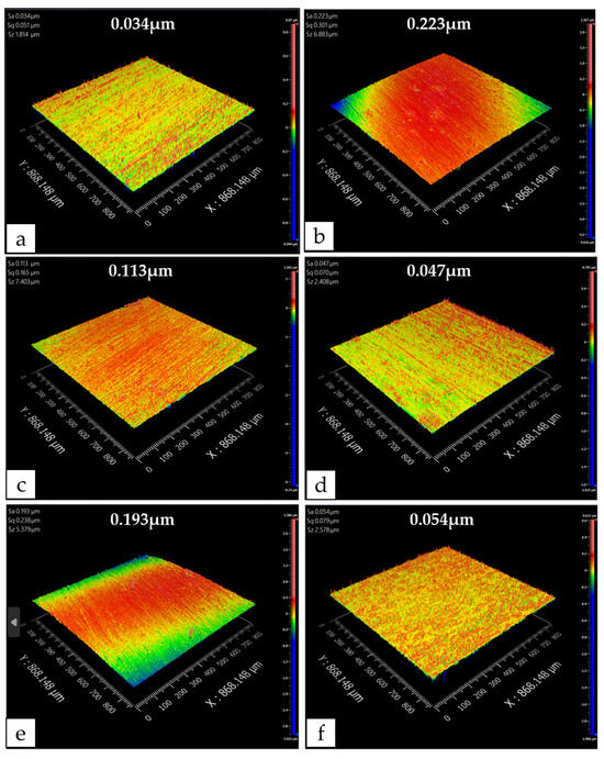 Comparing Figure 9b and Figure 9c–f, it can be found that regardless of the method of adding 0.01 wt% MoS2, the formulated lubricating grease will reduce the surface roughness of bearing steel after corrosion. The adoption of the “Method B” resulted in the maximum reduction of surface roughness (Figure 9d) by 0.176 μm. The process of “Method C” (Figure 9e) having the least reduction in surface roughness resulted in a reduction of only 0.03 μm. The 3D morphology in Figure 9 is in good agreement with the SEM results in Figure 8. This further indicates that adding MoS2 additive can slow down the corrosion rate of bearing steel and can protect the corrosion of the device for a long time under natural conditions.