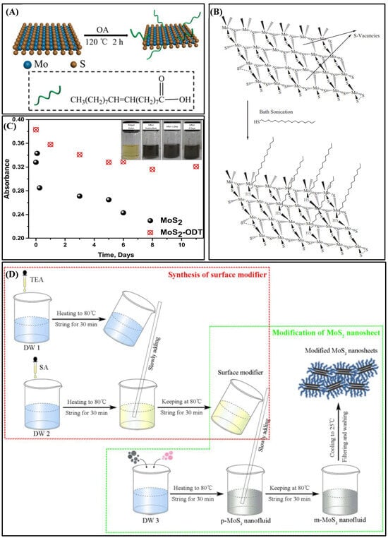 Surface modification is a commonly used method for MoS2 surface modification. Through surface grafting modification, specific functional groups in surfactants are grafted on the surface of nanoparticles to improve their oil solubility, so that the nanoparticles can be stably dispersed in lubricating oils, which has become an important direction in the research on the practicalization of nano-lubricant additives [82,83,84]. OA is an unsaturated fatty acid, which is often used as a chemical modifier for MoS2 [85,86]. Wu et al. [85] successfully obtained OA-MoS2 by one-step modification of homemade five-layer-thickness MoS2 nanosheets with oleic acid (Figure 4A). The OA molecules chemically confined the MoS2 nanosheets through C-S bonding, which significantly improved the dispersion and stability of the MoS2 nanosheets in the base oil. The results of four-sphere machine tests showed that the addition of OA-MoS2 nanosheets significantly improved the friction reduction, anti-wear, and extreme pressure capabilities of the base oil. Kumari et al. [87] chemically functionalized MoS2 using octadecanethiol (ODT). Structural defects and empty sulfur sites on the Mo atoms of MoS2 nanosheets were the targets for the grafting of ODT via Mo-S coordination bonds (Figure 4B). Van der Waals interactions between the octadecyl chains of MoS2-ODT and the oleate chains of polyol ester lubricants facilitated MoS2-ODT nanosheet dispersion (Figure 4C).