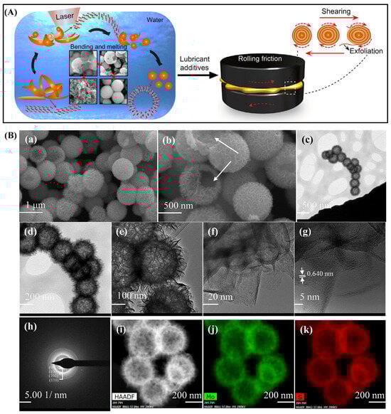 (A) Schematic of the growth of fullerene-like MoS2 nanospheres and their lubrication mechanism as lubricant additives: Under laser irradiation-induced instantaneous ultrahigh temperature and ultrahigh pressure, MoS2 nanoflakes will bend and melt in water at ambient conditions. The following quenching process of surrounding water solidifies the liquid MoS2 droplet into ideally fullerene-like nanospheres. (Reproduced from Ref. [104]), (B) SEM and TEM images of hollow core-shell MoS2 nanoparticles: (a,b) SEM and (c–k) TEM images of the hollow core-shell MoS2 nanoparticles. Moreover, the broken hole in Figure 2B (directed by arrows) illustrates a hollow structure (Reproduced from Ref. [105]).