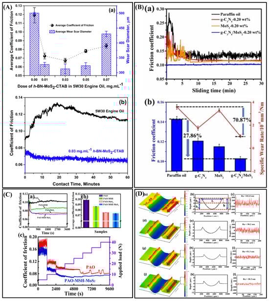 (A) (a) Average friction coefficient and WSD for steel tribe-pair using 5W30 fully formulated engine oil and its blend with variable doses of the h-BN-MoS2-CTAB heterostructure, (b) Friction profiles of steel tribe-pair using 5W30 fully formulated engine oil and its blend with h-BN-MoS2-CTAB (Reproduced from Ref. [92]). (B) (a) The curves in regard to friction coefficient of oil with g-C3N4 nanosheets, spherical MoS2, and g-C3N4/MoS2 nanocomposites at 0.20% concentration or without additive; (b) the parallel average friction coefficient and wear rate of steel sheets after being lubricated by these samples in sequence (Reproduced from Ref. [112]). (C) (a) COF curves as a function of sliding time, (b) average values for steel/steel under the lubrication of four kinds of oil samples, and (c) COF curves with the lubrication of PAO and PAO-MSH-MoS2 under different loads. (D) 3D topographies, wear scars profiles perpendicular to sliding directions, and surface height profiles along with the sliding directions in GCr15 discs under the lubrication of PAO (a–c), PAO-MSH (d–f), PAO-MoS2 (g–i), and PAO-MSH-MoS2 (j–l) (Reproduced from Ref. [113]).