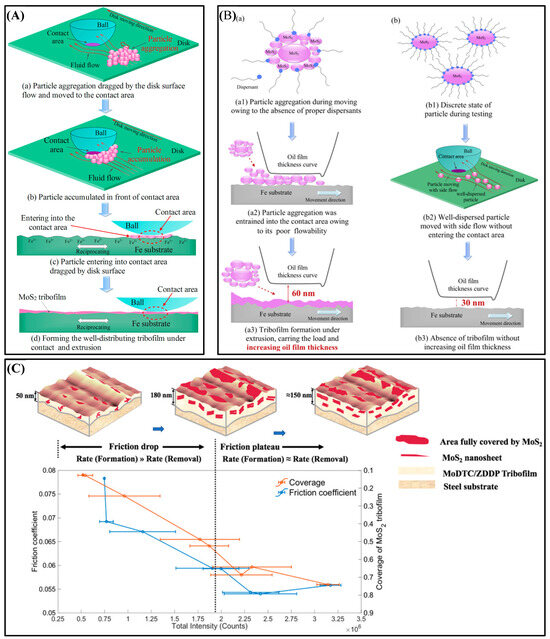 (A) Proposed lubrication mechanism for influence of dispersants on oil film thickness (Reproduced from Ref. [131]). (B) Proposed lubrication mechanism for influence of dispersants on oil film thickness. (a) In PAO4 base oil without proper dispersants and (b) in the presence of rich dispersants (Reproduced from Ref. [132]). (C) Schematic diagram of the MoDTC-derived tribofilm evolution (Reproduced from Ref. [133]).