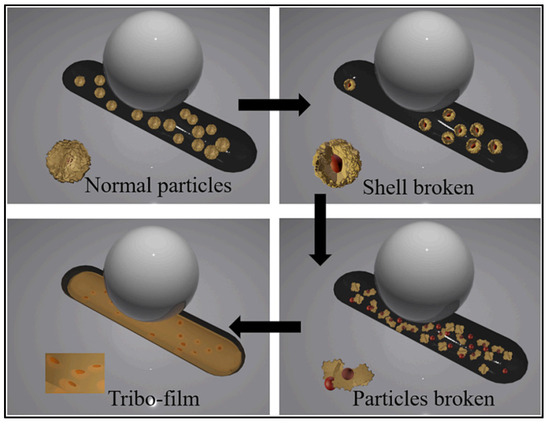 It is worth noting that in most practical friction processes, nanoparticles do not act through a single lubrication mechanism, but rather two or more mechanisms act simultaneously [128]. The combination of different mechanisms leads to some extent to the complexity of mechanism studies. Kumari et al. [87] showed that when fully dispersed MoS2-ODT was used as an additive in polyol lubricant base oils, the uninterrupted supply of MoS2-ODT nanosheets on the friction contact surfaces resulted in the formation of MoS2 films at the friction interface, and the easy shear driven by weak van der Waals interactions between the MoS2 lamellae and the high mechanical strength of MoS2 combined to improve friction performance. Zhang et al. [142] prepared carbon ball surface-coated MoS2 (C@MoS2) by a hydrothermal method to realize the unification of the lubrication characteristics of carbon balls (CS) with the high load carrying capacity and low shear friction performance of MoS2. Then, 0.5 wt% of C@MoS2 particles were dispersed into PAO40 to enhance the anti-wear and friction reduction capability. The excellent tribological properties of C@MoS2 particles were attributed to the filling effect of CS and the synergistic lubrication between bearings as well as the friction reduction capability of the MoS2 shell layer. In this study, the synergistic lubrication mechanism of C@MoS2 can be categorized into different stages (shown in Figure 11): (1) shell layer fragmentation stage, which corresponds to the rolling bearing effect of C@MoS2 particles at the friction interface; (2) core/shell separation stage, which corresponds to the rolling bearing effect and the self-repairing effect of the C@MoS2 particles; and (3) core/shell composite stage, which corresponds to the formation of the protective film and the enhancement in which the friction and wear performance is substantially improved.
