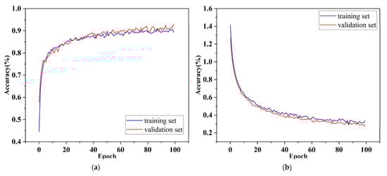 Through the analysis of experimental data, it can be seen that the two subnetwork models have a high accuracy improvement speed in the first 20 rounds of iteration. At 20 rounds, the accuracy of both models can be improved to about 80%. With the increase in iteration times, the training accuracy of SepViT gradually exceeds that of ResNet50, and the verification accuracy is similar. As shown in Figure 11b and Figure 12b, during the first 20 iterations of the two models, both the training loss and the verification loss showed a rapid downward trend. With the increase in iteration times, the training loss and verification loss of ResNet50 decreased almost synchronously, while the loss gap of SepViT became wider and wider. The training loss was lower than that of ResNet50, and the verification loss was higher than that of ResNet50, as shown in Figure 11a and Figure 12a.