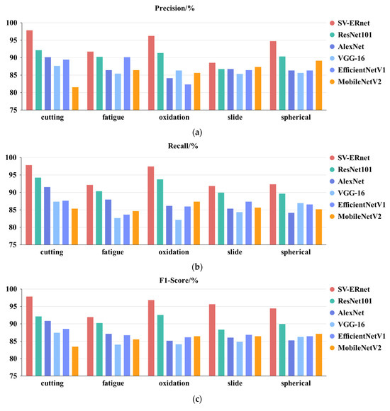 In order to further understand the advantages of the integrated model in this paper, the proposed SV-ERnet and other models evaluated the classification effect of each kind of wear particle in detail. The specific details are shown in Figure 14a–d, which, respectively, correspond to the performance indices of each model for identifying different wear particles, namely, precision, recall, specificity, and F1-Score. From the histogram results, it can be seen that SV-ERnet has more comprehensive advantages than other models and has the best effect in the task of wear classification.