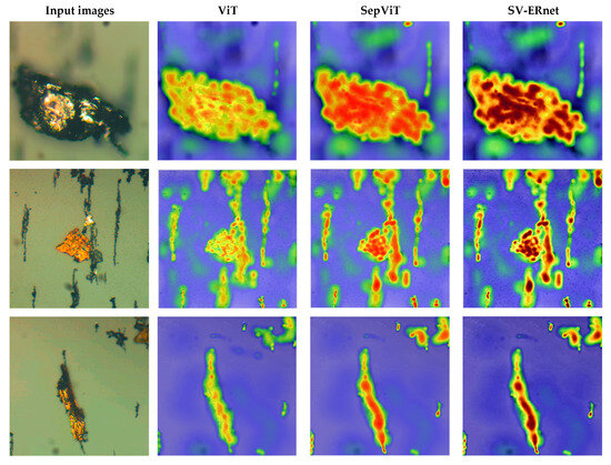 Interpretability is very important for the task of wear particle image classification. Therefore, in this paper, the weighted gradient-like activation thermography (Grad-CAM) method is adopted to analyze the feature importance of wear particle image features [36]. The interpretability of the model allows classifiers to locate feature regions more efficiently and make effective judgments. As shown in Figure 17, two important types of abnormal wear particles, fatigue and severe sliding wear particles, were selected. The darker color in the activated heatmap indicates that the integrated model SV-ERnet, due to the utilization of depthwise separable convolutions and self-attention mechanisms, focuses more accurately on the regions during feature extraction and recognition compared to ViT and SepViT. It exhibits higher attention and learns more deeply than ViT and SepViT, leading to higher accuracy in recognition and classification.