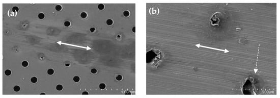 In general, the wear track of the micro-drilled surface was much smoother than that of the bare surface, although worn scratches were well developed along the micro-drilled surface. According to the Hertz contact theory, the contact radius under the ball contact is approximately 50 μm. However, the approximate width of the wear track shown in Figure 8a is definitely larger than 800 μm (that is, at least 15 times larger). This indicates a large growth in the contact area owing to wear with oscillating contact. The worn fragments may gradually fill the holes, as shown in Figure 8b, and finally the surface becomes flat with scratches. In some cases, the holes are partially covered by plastic shearing, as indicated by the dotted lines in Figure 8b–d. The lubricant retention capability is subsequently diminished. A thin sheared layer is also clearly seen along both the upper wear track and the track edge, as shown in Figure 8c,d, respectively. Compaction and attachment of the worn particles to the sled layer are clearly shown in Figure 8d.