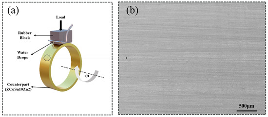 where D (mm) is the outer diameter of the tin bronze ring and b (mm) and t (mm) are the average width of the abrasion mark and the width of the rubber block, respectively. To ensure the reliability of the experimental data, the average of three measurements is taken as the experimental data.