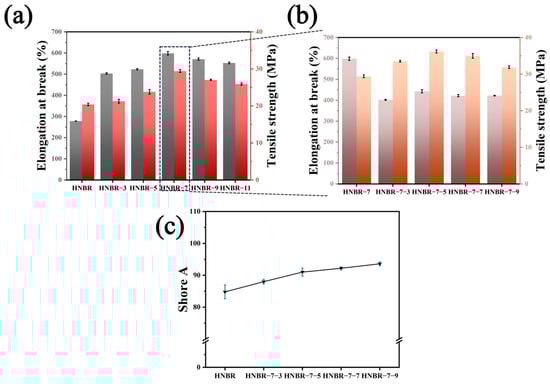 Mechanical properties have an important impact on the application of materials, and the introduction of EEUG and HER into HNBR will inevitably cause changes in its mechanical properties. For this purpose, tensile measurements were performed, and the results obtained are shown in Figure 4. The tensile strength and elongation at break of the composites increased from 278.52% and 20.41 MPa to 598.4% and 29.4 MPa, respectively, with the addition of EEUG. For rubber composites with different additions of EEUG, the elongation at break and tensile strength increased with the increase in EEUG content. This indicates that the addition of EEUG improves the mechanical properties of pure HNBR. This is due to the good compatibility between EEUG and HNBR, and the incorporation of EEUG as a physical crosslinking point increases the entanglement between molecular chain segments. With the addition of HER, a dual network co-crosslinking system was formed under the dual crosslinking of sulfur and MOCA. The maximum tensile strength of the material is 36.17 MPa, which is 78.5% higher than that of pure HNBR. This is attributed to the incorporation of HER to form a second network, and in the double crosslinking system, the chain segments of the polymers are chemically crosslinked and physically entangled, resulting in the formation of a denser structure. The hardness of the material increases at the macroscopic level.