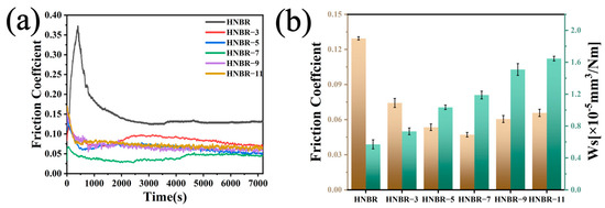 The tribological properties of composites have a decisive influence on their service conditions. By investigating the frictional properties of HNBR and EUG at different ratios, the frictional wear curves of HNBR/EEUG composites at different ratios under water lubrication conditions are shown in Figure 6. From Figure 6a, it can be seen that the friction curves showed very different trends after the addition of EEUG. The HNBR showed an increasing and then decreasing trend at the beginning of the friction, while the friction coefficients all showed a rapid decrease after the addition of EEUG, and then they all leveled off. In the early stages of friction, pure HNBR experiences a boundary lubrication state due to the growth of the transfer film and an increase in the friction vice contact area. This leads to an initial rise followed by a subsequent decrease in the friction coefficient. HNBR/EEUG composites show a different behavior during the initial stages of sliding, where the formation of a water film leads to a rapid decrease in the surface friction coefficient from boundary lubrication to mixed lubrication [37]. With water film stabilization, the friction coefficient of the decline gradually slows down and eventually stabilizes. With the increase in EEUG content, the friction coefficient appeared to decrease and then increase. At 7%, the material’s coefficient of friction reached a minimum of 0.047, and it is exciting that the friction coefficient with the addition of EEUG is less than that of the pure HNBR. It can be concluded that the addition of EEUG is of great significance in improving the tribological properties of HNBR. The reduction in the friction coefficient is mainly attributed to the plasticizing and softening effect of EEUG on HNBR, which makes the contact area between the friction pair increase, and the larger friction surface makes the water film have a larger carrying capacity [38]. As shown in Figure 6b, the wear rate increases gradually with the addition of EEUG. The reduction in hardness makes the material more likely to adhere to the pair of surfaces under shear, which reduces the load-bearing capacity of the water film rupture, increases the coefficient of friction, and makes it more susceptible to wear [39].