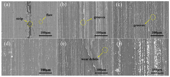To study the microscopic wear of the friction material, a scanning electron microscope was used to observe the friction surface. As shown in Figure 7a, the pure HNBR friction surface has stripping and microcracks along the friction direction, which is mainly dominated by adhesive wear. As shown in Figure 7b–f, after the addition of EEUG, the friction surface shows plow furrows, which are mainly dominated by abrasive wear, which is caused by the microcutting of the polymer by the hard tin bronze surface. With the addition of EEUG, the modulus of the material gradually decreases, which reduces the abrasion resistance of HNBR and aggravates the abrasion of the material under strong shear force.