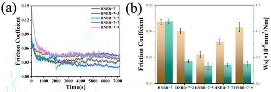 (a) Friction profile coefficients. (b) Average COF and Ws of HNBR/EEUG with different blending ratios.