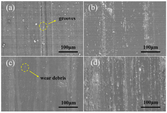 Figure 9 shows SEM images of the friction surfaces of the dual network co-crosslinked composites at different mass ratios. As shown in Figure 9b–d, a small number of grooves gradually disappeared after the formation of the dual network co-crosslinking system, and the friction surface became flatter, mainly dominated by slight plastic deformation. The flat friction surface makes the water film stronger and more complete, which is more conducive to the separation of the water film from the friction subsurface, while the material friction surface produces only a small amount of wear debris [40]. As Figure 9c shows, the friction surface is flat with only a small amount of abrasive debris, which is mainly dominated by slight abrasive wear [41]. All the above results indicate that the dual network co-crosslinked composites possess a low coefficient of friction and wear rate.