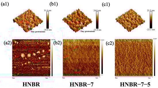 The phase morphology of the friction surface was examined using AFM in tap mode. The surface roughness and surface properties of the composite material are critical for the friction properties of the material. The AFM image is 256 × 256 pixels with a scanning range of 5 μm × 5 μm. The AFM image of the material is shown in Figure 10. From the comparison of the AFM morphology of the friction surface after friction with the phase image, Figure 10(a1–c1) show that in the material surface images, the material rms roughness Rq is 9.85 nm, 8.01 nm, and 7.92 nm in order, and the roughness decreases in order, which corresponds to the friction coefficient of the material [42]. The smoother surface may be an important factor in the formation of a stable water film during the friction process, avoiding large protrusions that can pierce the water film and weaken the lubrication effect. The low roughness reduces the mutual resistance between the friction partners and thus improves the boundary lubrication, resulting in a material with a lower coefficient of friction and wear rate [43]. The corresponding phase diagrams show that the latter has changed considerably from pure HNBR, as shown in Figure 10(a2–c2), where agglomeration of carbon black particles is unavoidable in pure HNBR, and the addition of EEUG improves the compatibility of carbon black. No obvious phase separation was observed in the phase diagrams of the latter two, which proves that the components of the prepared materials have good compatibility.