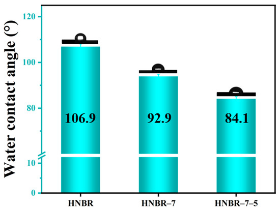 The water contact angle was tested on the friction surface of the samples. As shown in Figure 11, the water contact angle decreases sequentially, and the water contact angle of the dual network co-crosslinked system decreases by 22.8° with respect to the pure HNBR. The hydrophilicity of the material improves due to the introduction of both EEUG and HER with hydrophilic groups [44]. The hydrophilic surface facilitates the formation of a water film during friction, which can better separate the friction partners, thus reducing the coefficient of friction and wear rate.
