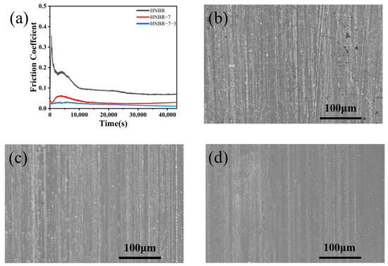Comparison of friction curves for different samples over 12 h (a) and the after-wear surface micrograph for samples HNBR (b), HNBR-7, (c) and HNBR-7-5 (d).