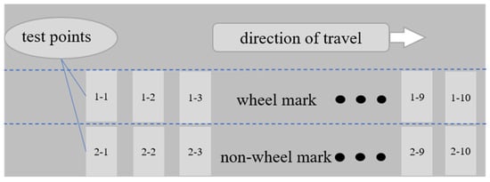 This study gathered test data from five stations. To discern variations in road anti-skid performance influenced by vehicle tire wear, each station was subdivided into wheel track belts and non-wheel track belts. At intervals of 5 m between the wheel track belt and non-wheel track belt, a point was chosen, resulting in a total of 20 test points (10 wheel track belts and 10 non-wheel track belts), as shown in Figure 1.