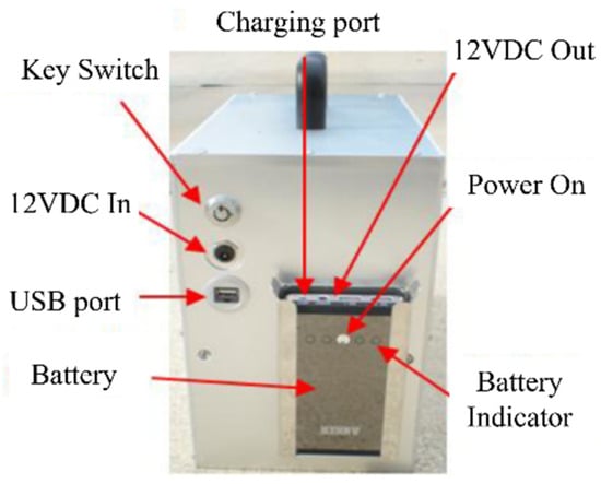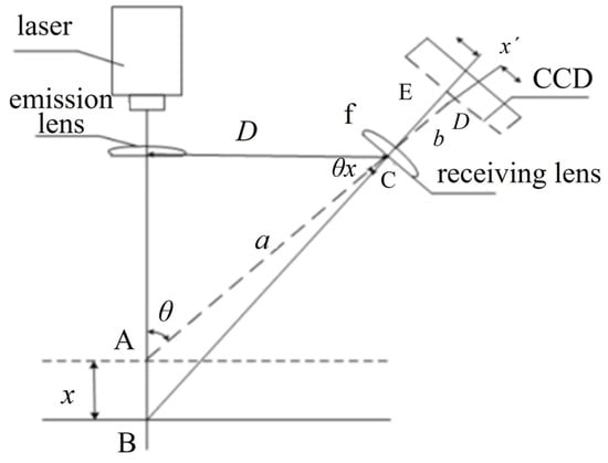 The LS-40 portable pavement 3D data collector and analyzer (AMES Engineering, Ames City, IA, USA) were utilized for obtaining 3D texture data. The scanning range encompassed 2048 transverse cloud points and 2048 vertical cloud points, with a transverse test accuracy of 0.05 mm and a vertical test accuracy of 0.01 mm. The equipment is depicted in Figure 2, below. Operated on the principles of laser triangulation, the device employs the laser triangulation algorithm to process images for intensity and height measurements. In this context, θ represents the angle between the laser and CCD camera, b is the focal length, D denotes the horizontal distance between the two lenses, a signifies the distance between the receiving lens and the actual measuring point, x represents the true depth change of the object surface, and x′ denotes the displacement change on the corresponding camera plane. Additional parameters are illustrated in Figure 3, below. To begin using the product, connect the LS-40 + 12VDC IN port to the battery + 12VDC OUT port using the provided power cord. Next, connect the LS-40 USB port to a USB 2.0 or USB 3.0 port on a desktop or laptop computer. Finally, turn on the key switch and press the Battery On button to activate the battery power output.